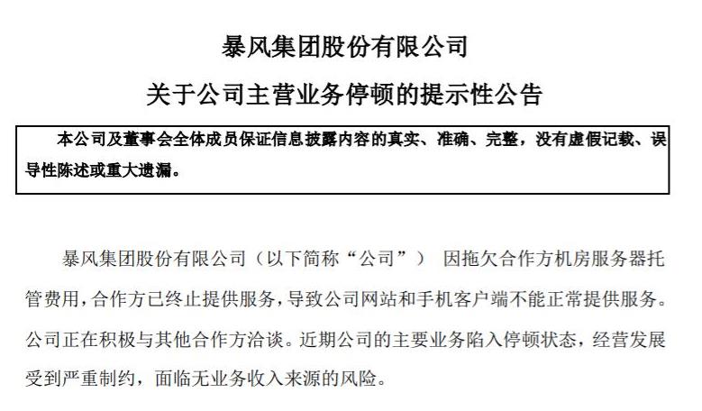 Time:2019-11-28DoNews 11月27日消息(記者 趙晉杰)暴風(fēng)集團(tuán)11月27日晚發(fā)布公告稱,因拖欠合作方機(jī)房服務(wù)器托管費(fèi)用,合作方已終止提供服務(wù),導(dǎo)致公司網(wǎng)站和手機(jī)客戶端不能正常提供服務(wù)。暴風(fēng)在公告中表明,目前公司資金狀況緊張,難以維持正常運(yùn)轉(zhuǎn),存在持續(xù)經(jīng)營(yíng)困難的風(fēng)險(xiǎn)。