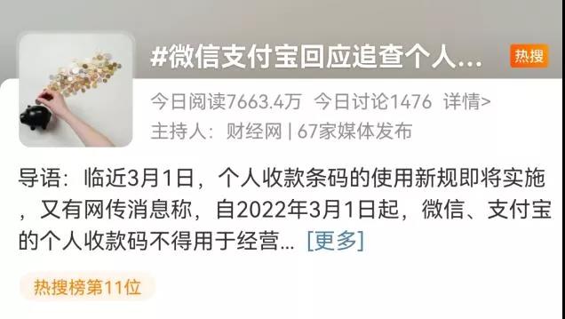 據(jù)媒體報(bào)道,近期有網(wǎng)傳消息稱,自2022年3月1日起,微信、支付寶的個(gè)人收款碼不得用于經(jīng)營性收款。不僅如此,近4年的數(shù)據(jù)將被追查,一旦數(shù)額較大需按4.5%補(bǔ)稅,還要繳納滯納金和罰款。對(duì)此,微信和支付寶回應(yīng)稱,追查個(gè)人收款碼近4年數(shù)據(jù)的說法為謠言。